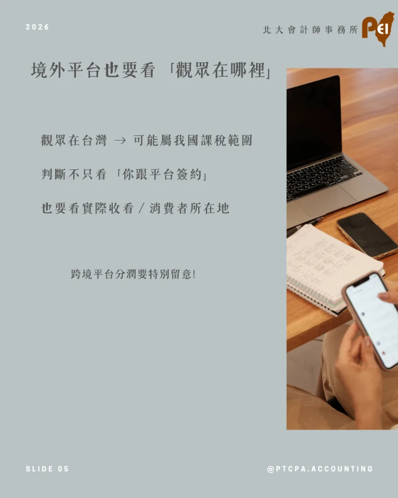 📍另外,若你的內容是授權平台播放、由平台向廣告主或觀眾收費,而你再從平台取得分潤,是否屬於我國課稅範圍,還會看「觀眾/消費者」所在地: